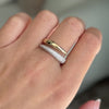 The contrast between the diamond-set arc and the sleek gold curve creates a striking sense of movement and dimension. Each diamond is carefully set to maximize sparkle, forming a continuous ribbon of light that enhances the ring’s elegant structure.