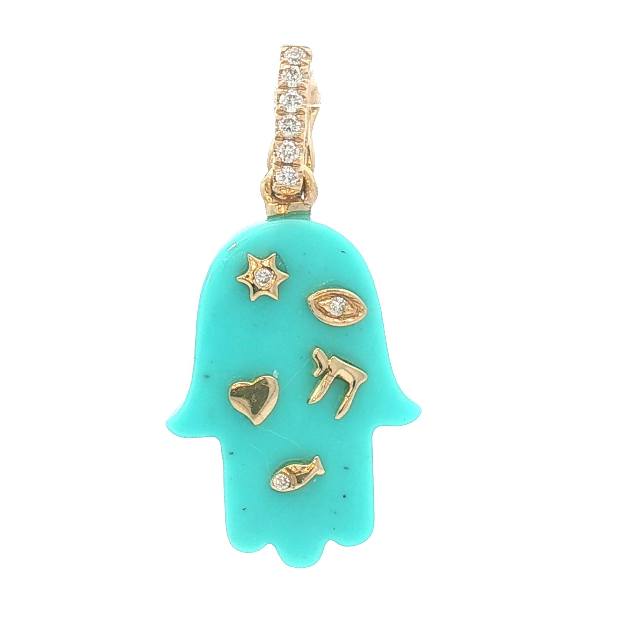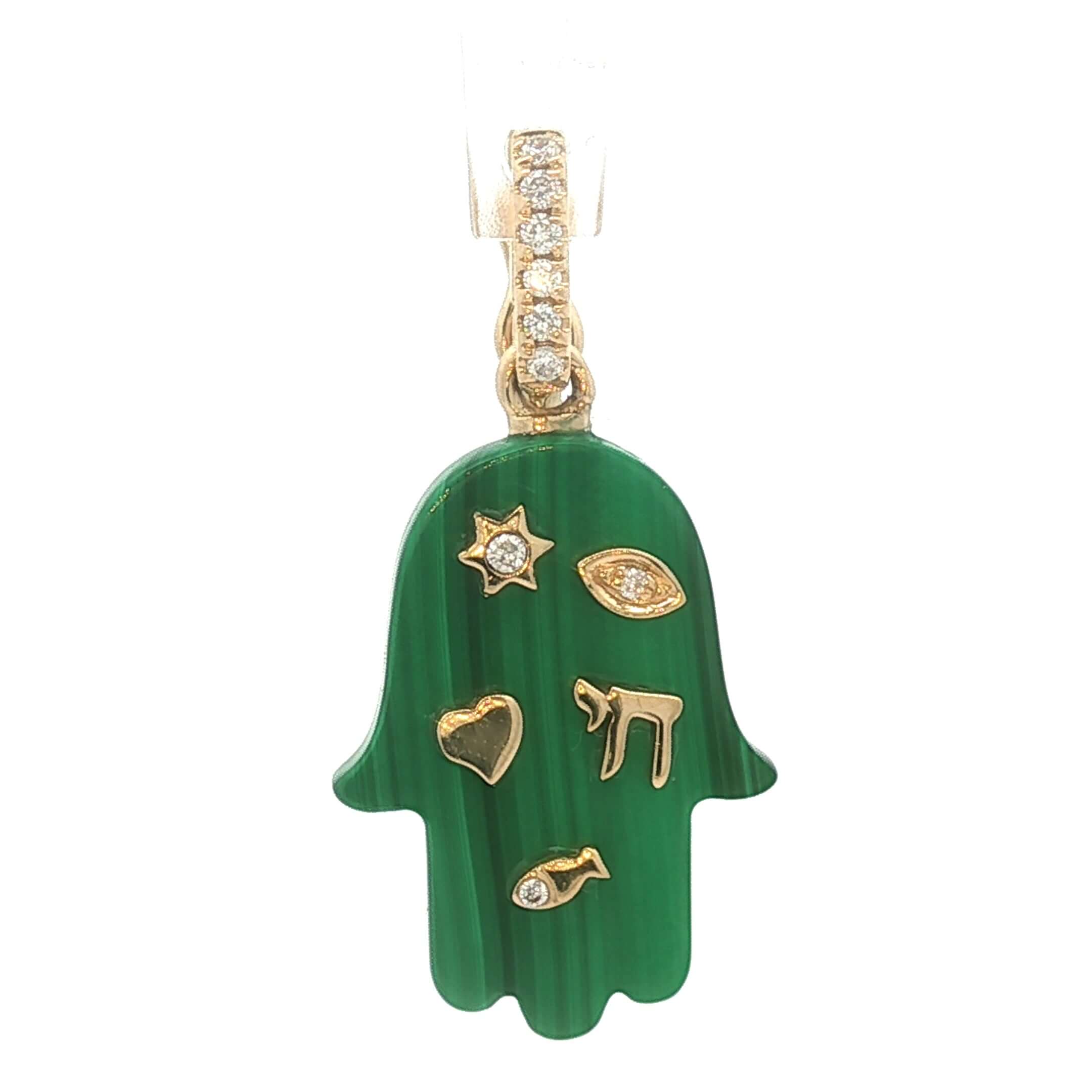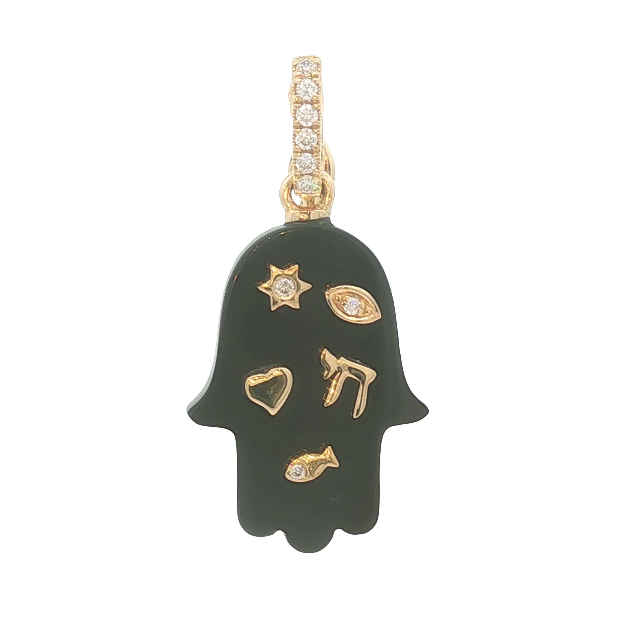 This signature Izakov 14K Gold Jewish Charms Hamsa Gemstone Pendant design presents a sophisticated gemstone-cut Hamsa pendant crafted in solid 14K gold. Select your preferred gemstone centerpiece from exquisite options including mother of pearl, onyx, lapis, or malachite. The pendant is adorned with diamond-accented Jewish symbols of protection and prosperity: the Star of David, evil eye, Chai (חי), heart, and lucky fish—each element meticulously integrated to create a meaningful heirloom that balances traditional symbolism with contemporary luxury.