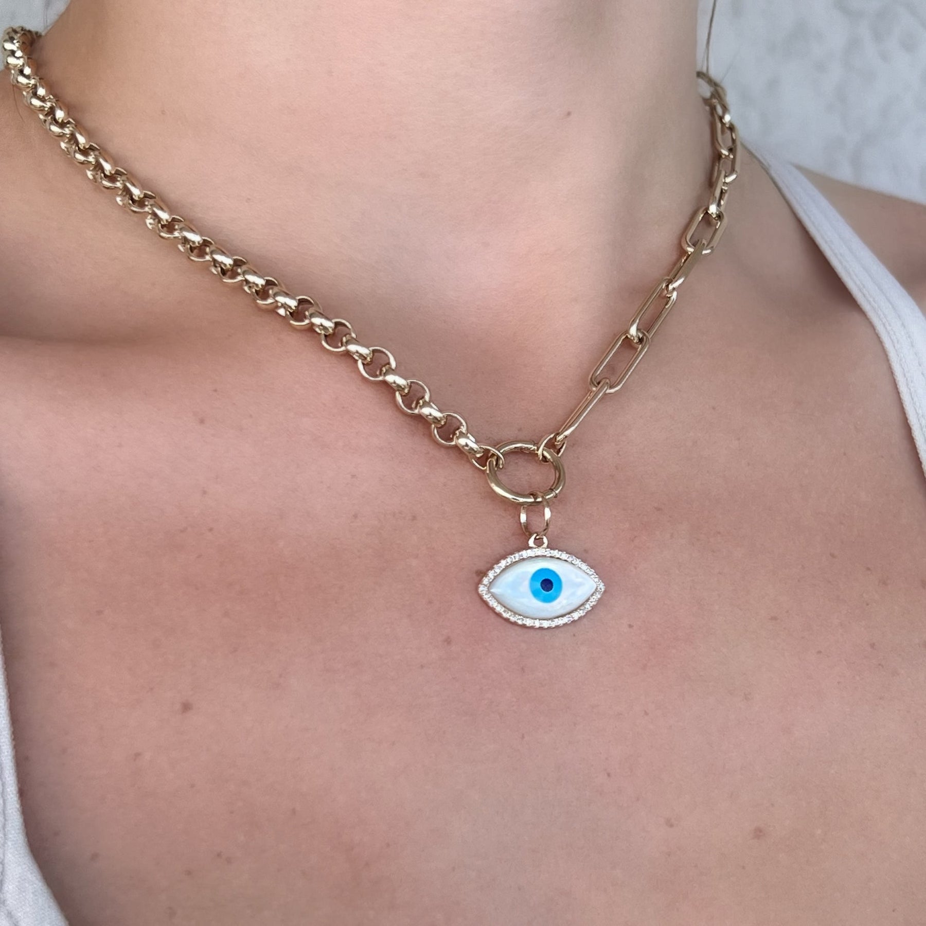 Our 14k yellow gold semi-hollow Italian made half chunky rolo half round paper clip link chain comes with an enhancer clasp, which give you the option to easily add a charm. A perfect layering chain.