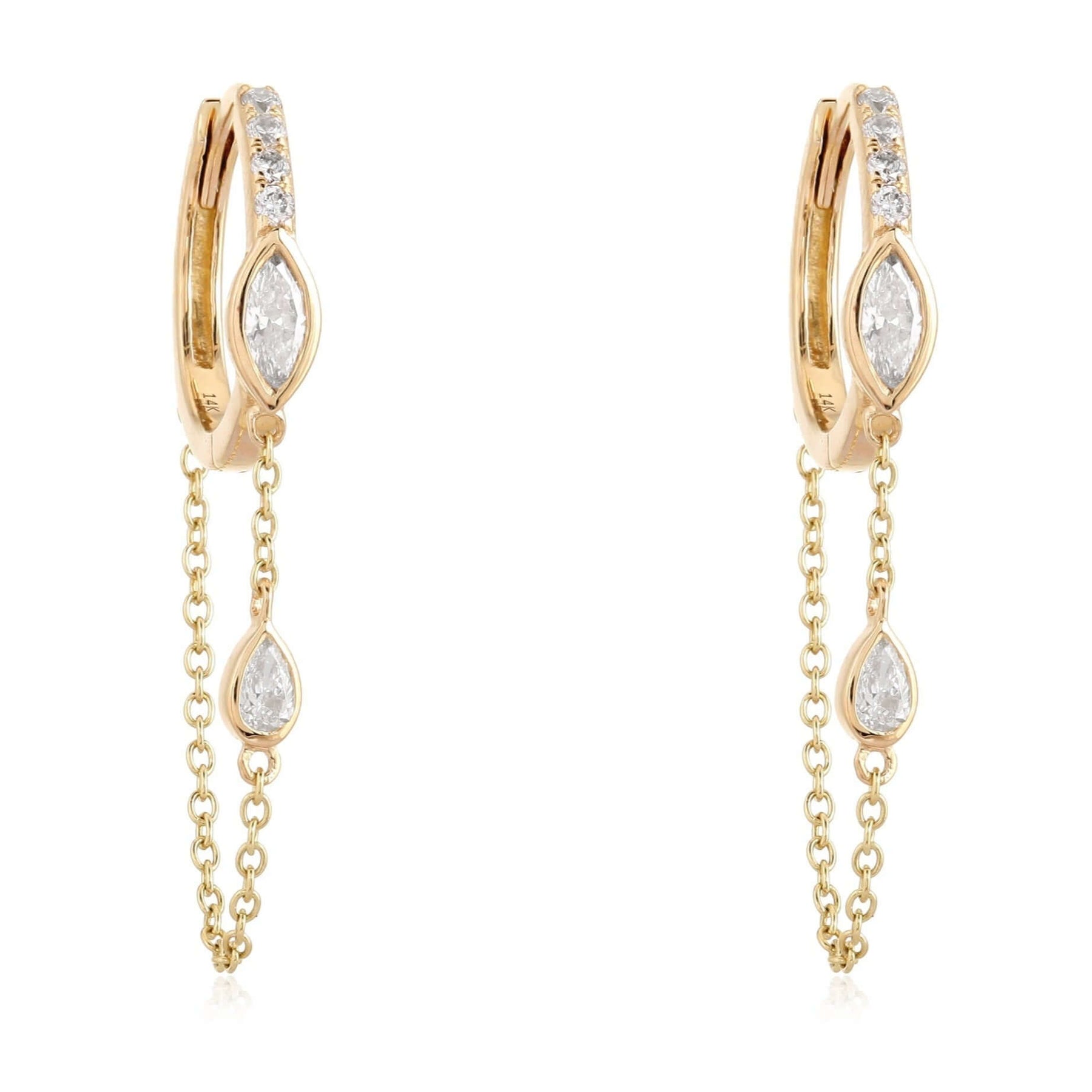 These 14K gold huggie earrings feature a unique and elegant design, with a dazzling chain connecting a marquise and pear shaped diamond. Add a touch of sophistication to any outfit with these stunning earrings.