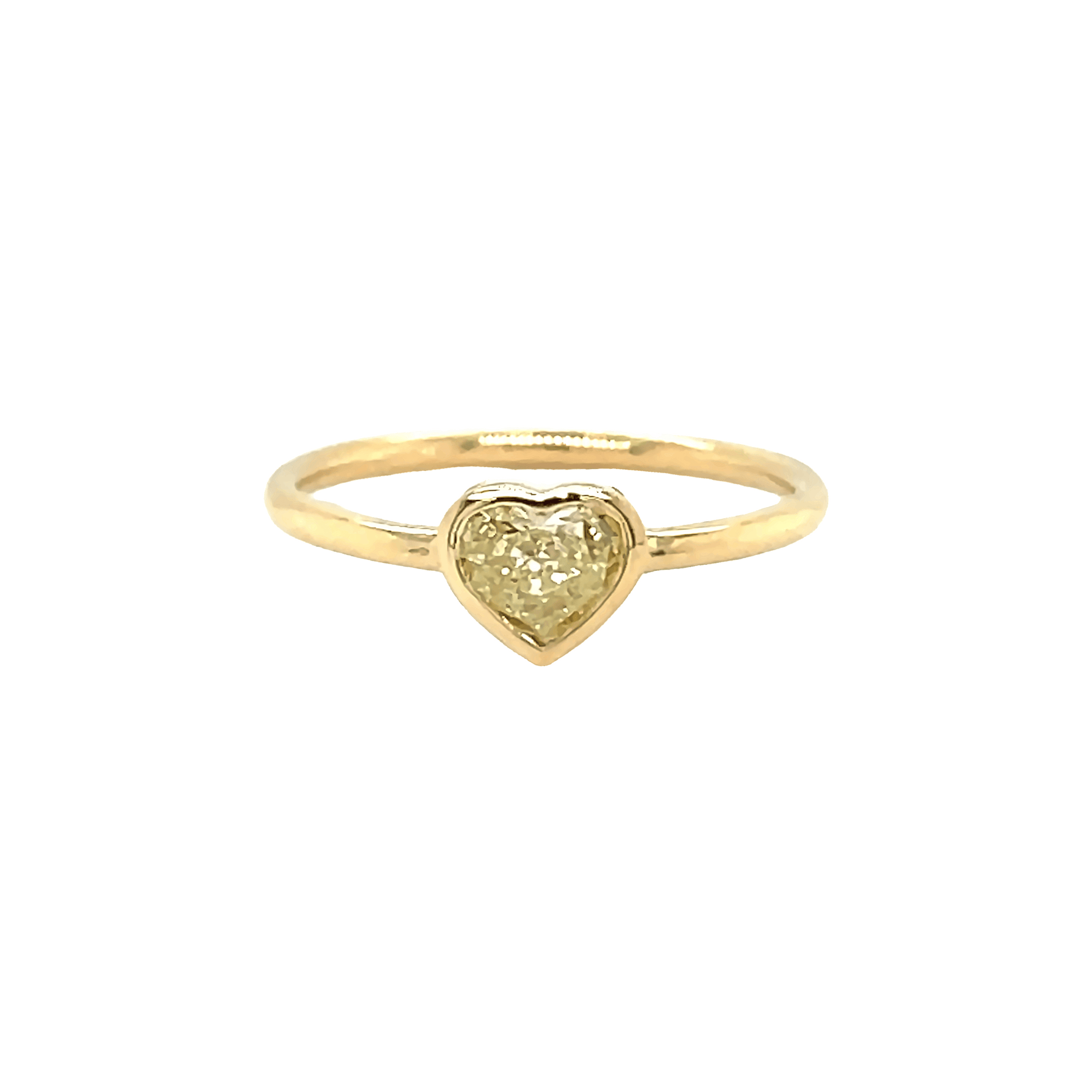 18k yellow gold bezel ring set with a 0.40-carat fancy yellow heart-shaped diamond. The diamond is graded by the Gemological Institute of America for quality assurance, so you can be confident in your purchase. Crafted with care and precision, this ring is perfect for celebrated occasions.